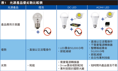目前已大幅应用在照明光源的高功率白光直流发光二极体(DC LED)(表1),其光源发光效率可达150lm/W。但DC LED是以直流电源驱动操作,若要使用在市电上,势必要外加交流对直流(AC-DC)整流器,电源转换将会造成20~30%的能源损耗,且驱动电路之体积也较为庞大,灯具设计弹性相对会受到限制。