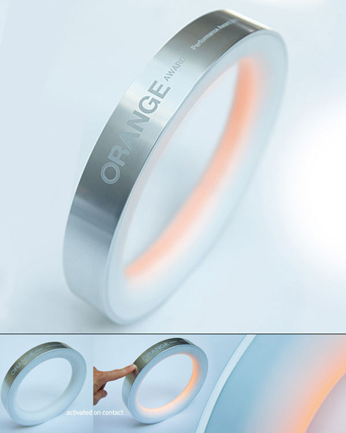 指环灯(ORANGE Award LED Light):来自The Brand Union GmbH,以及设计Norman Quadflieg、Stephan Pantel与Jens Tarnowski的创意,这款灯看上去就像是传说中的魔戒,用手指轻轻的触摸,指环内就能亮起非常漂亮的渐变橙色灯光。