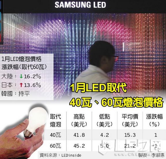至于日本市场则逆势上涨,1月取代40瓦的商品平均价格约上涨5.1%,而取代60瓦的商品价格则大涨13.6%。主要原因为新年后部份商品价格出现较大涨幅,如Panasonic 6.9瓦球泡灯,由12月的5.5美元上调至超过9美元,夏普10.4瓦全周光灯泡价格也由27美元左右上涨至41美元。
